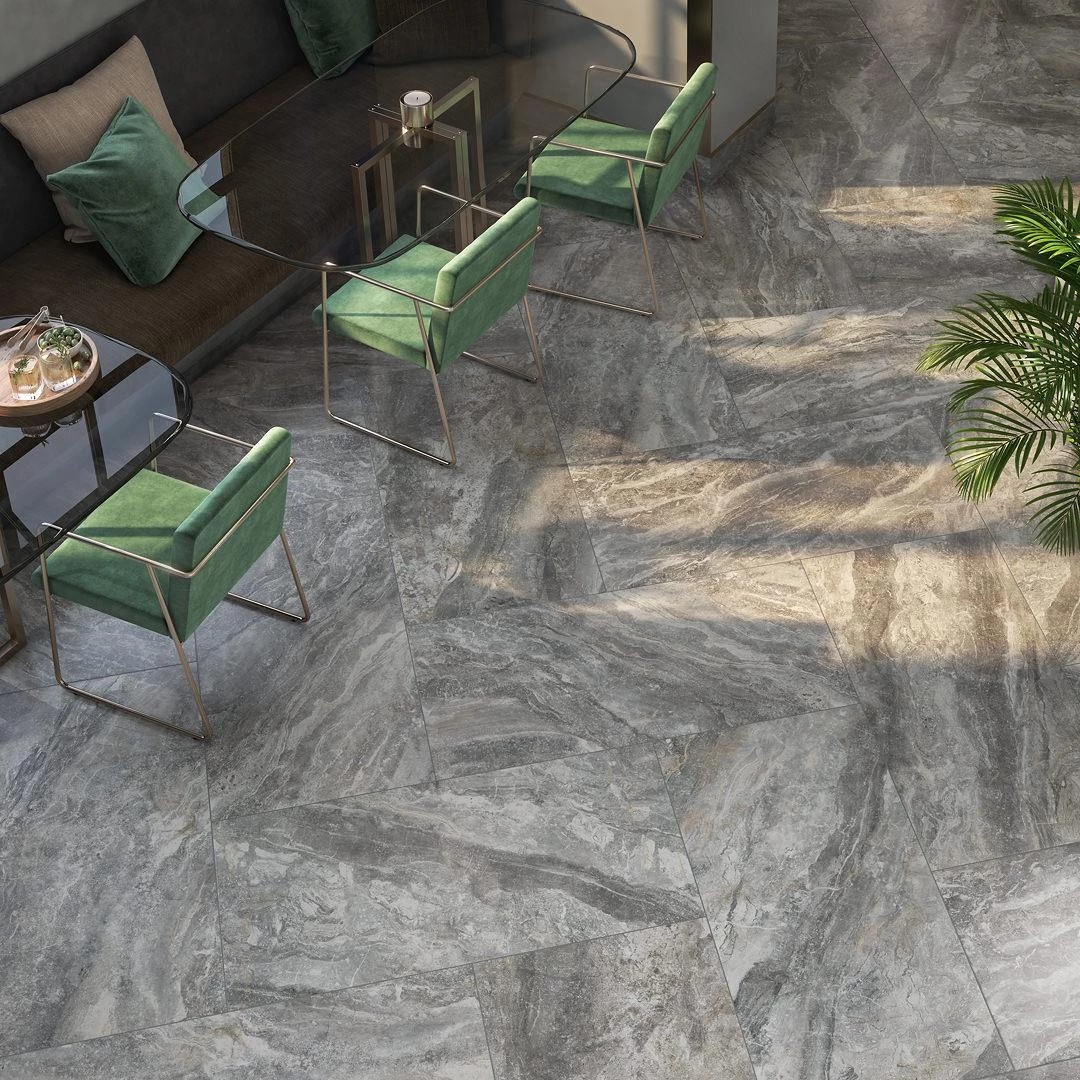 Поверхность мрамора «Арабескато Гриджио» передана в этой серии удивительно реалистично благодаря фактуре. Современная технология декорирования поверхности Dry Fix позволяет воспроизводить мельчайший рельеф, переливающиеся минеральные вкрапления и прожилки. Особую ценность материалу придают новый крупный формат и устойчивость к глубокому истиранию.