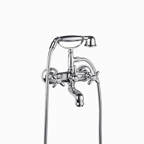 Настенный смеситель для ванны с переключателем, гибким шлангом длиной 150 см и душевой лейкой.